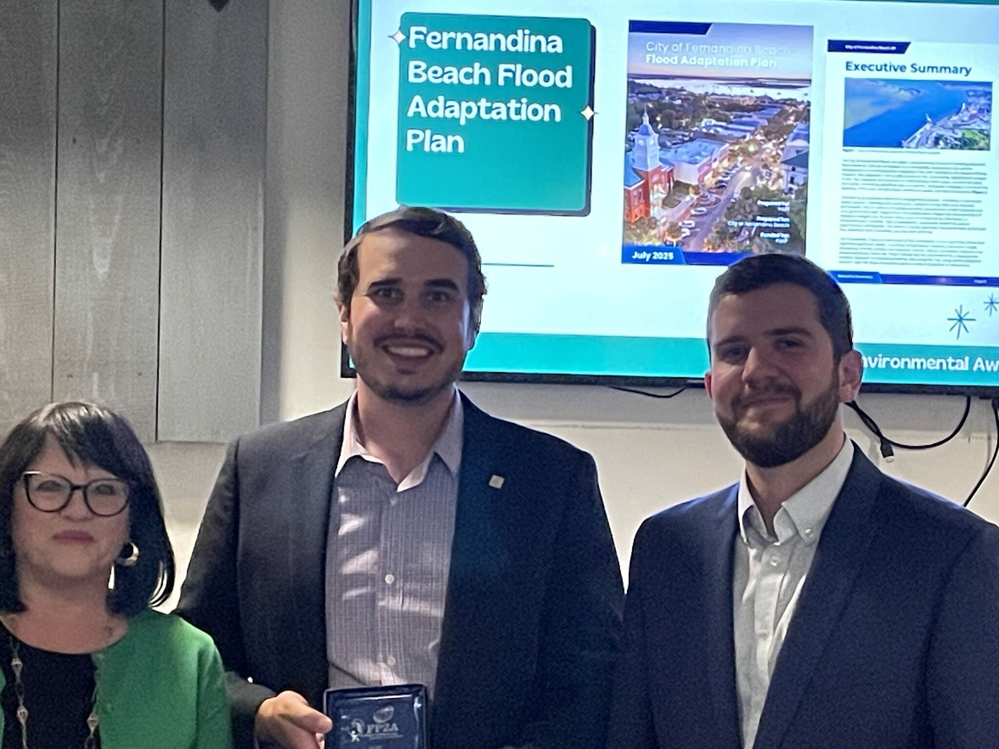 Patrick Doty (middle) and Sean Lahav (right) accepted the City of Fernandina Beach Flood Adaptation Environmental Award from a City of Fernandina Beach representative (left).